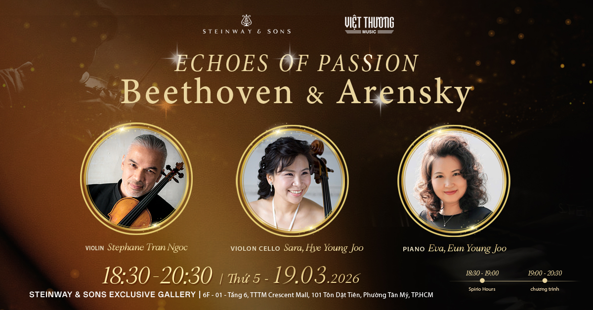 Echoes of Passion là hành trình âm nhạc đầy cảm xúc, âm vang những thanh âm bất hủ của nhà soạn nhạc tài ba Ludwig van Beethoven và Anton Arensky vang lên với tất cả chiều sâu và đam mê với sự biểu diễn của nghệ sĩ: Violin: Stephane Tran Ngoc - Piano: Eva, Eun Young Joo và Cello: Sara, Hye Young Joo.