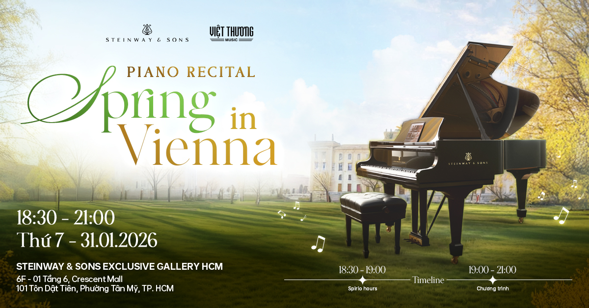 Âm nhạc cổ điển luôn mang trong mình sức sống bền bỉ, vượt qua không gian và thời gian để chạm đến những rung cảm sâu lắng nhất của mỗi tâm hồn. Đêm nhạc piano Spring in Vienna sẽ là một không gian nghệ thuật của Steinway, nơi khán giả được đắm mình trong vẻ đẹp thuần khiết của những giai điệu kinh điển, được thể hiện bởi các tài năng piano trẻ đến từ Nhạc viện Thành phố Hồ Chí Minh: Lê Phạm Bích Xuân; Lê Công Lập; Phan Đỗ Minh Triết; Nguyễn Thanh Hoa; Ngô Hoàng Lê Huy và Nguyễn Viết Minh Khang