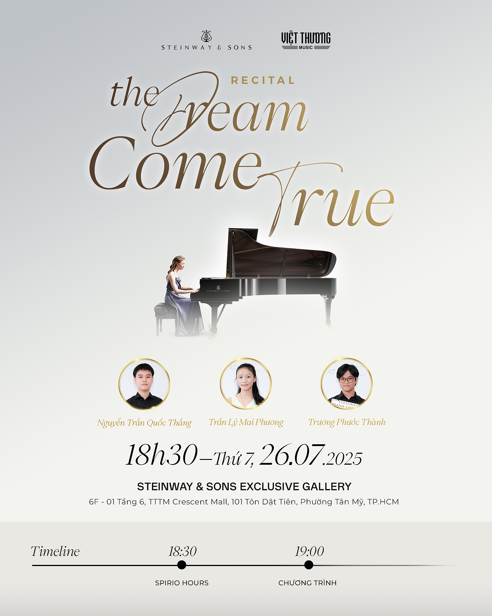 📍 Địa điểm: Steinway & Sons Exclusive Gallery, 6F-01 - Tầng 6, TTTM Crescent Mall, 101 Tôn Dật Tiên, Phường Tân Mỹ, TP.HCM